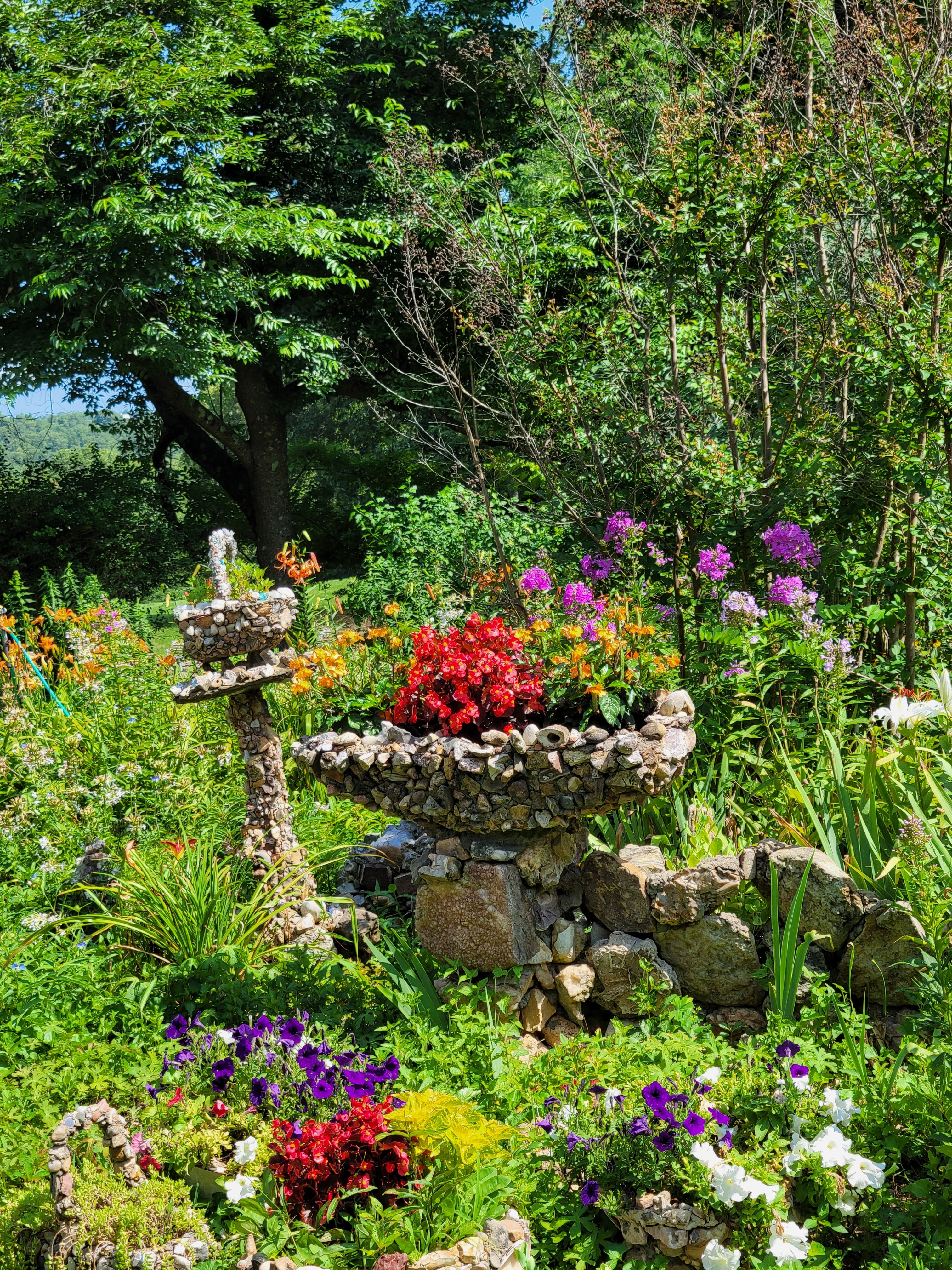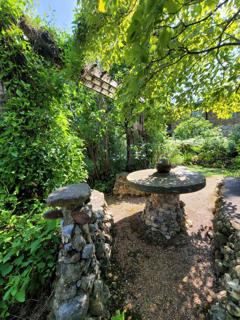 Individual stones Elise collected over a lifetime, pattern the walls and form sculptures and flowerpots, retaining walls and tables.