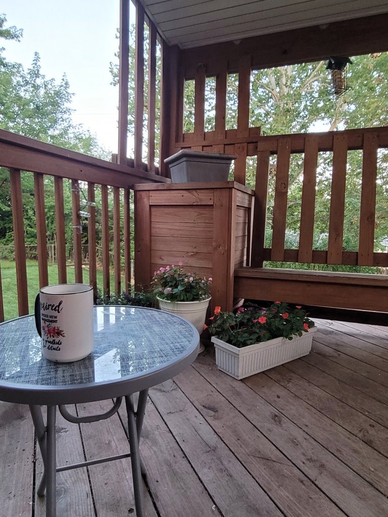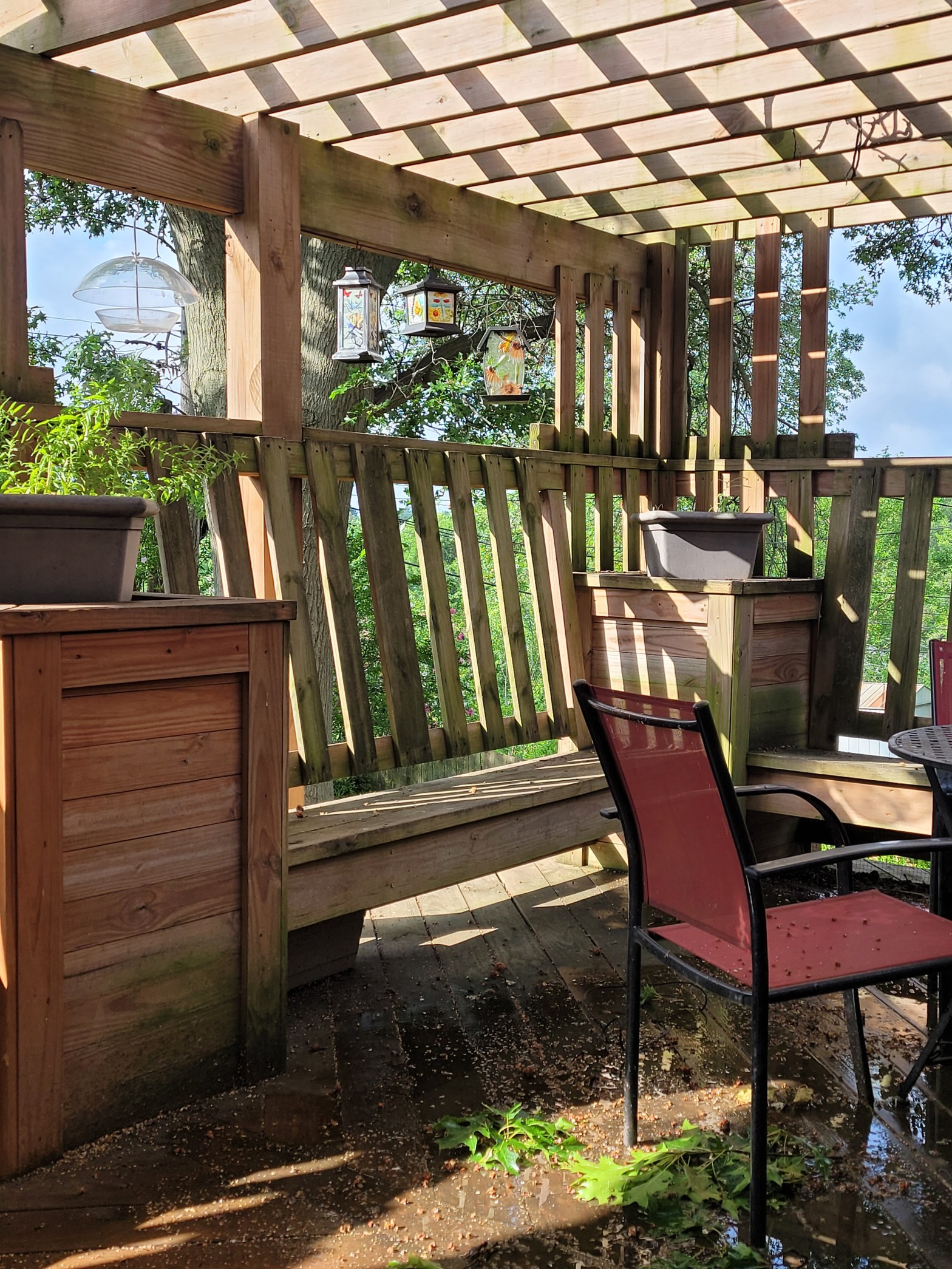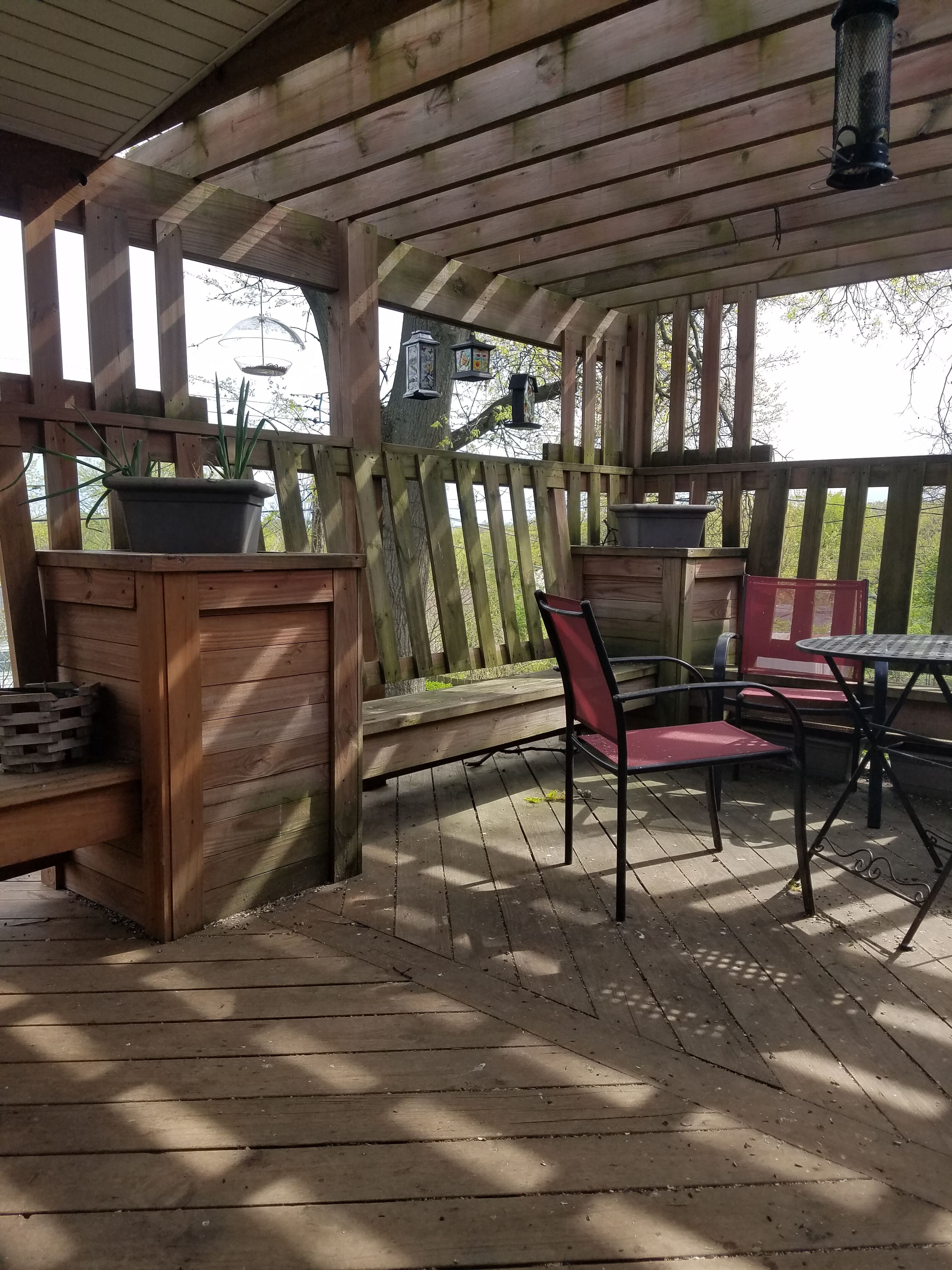 Deck cleaning and flower planting on a beautiful May Day Saturday. The birds were offended by my presence most of the morning, especially when I washed away their piles of seed on the floor of the deck. They fussed and chattered from the trees, but eventually decided to coexist when I retreated to the swing to read.
