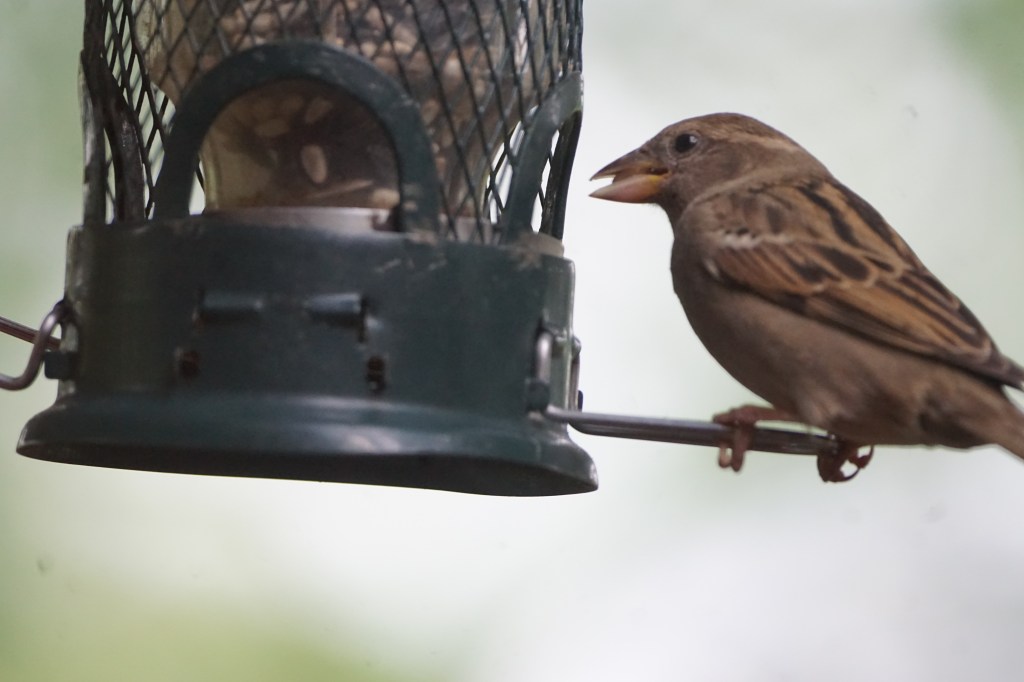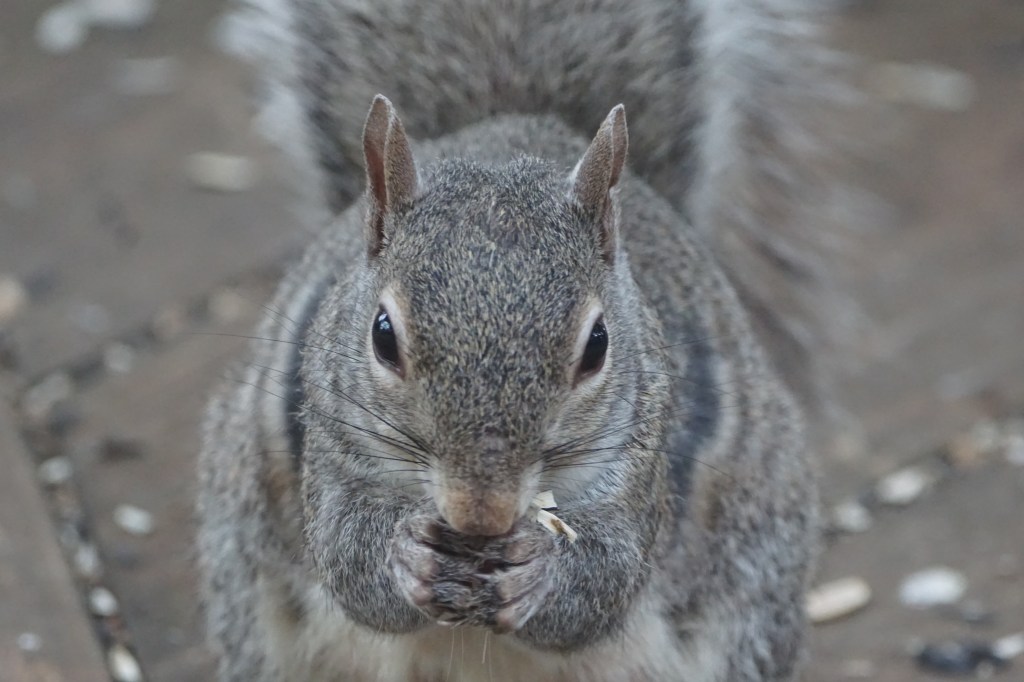 A grackle, a woodpecker, and two tiny cardinals joined daily pack of sparrows, pigeons, and of course squirrels today.