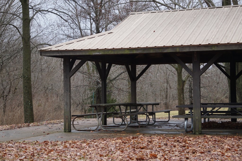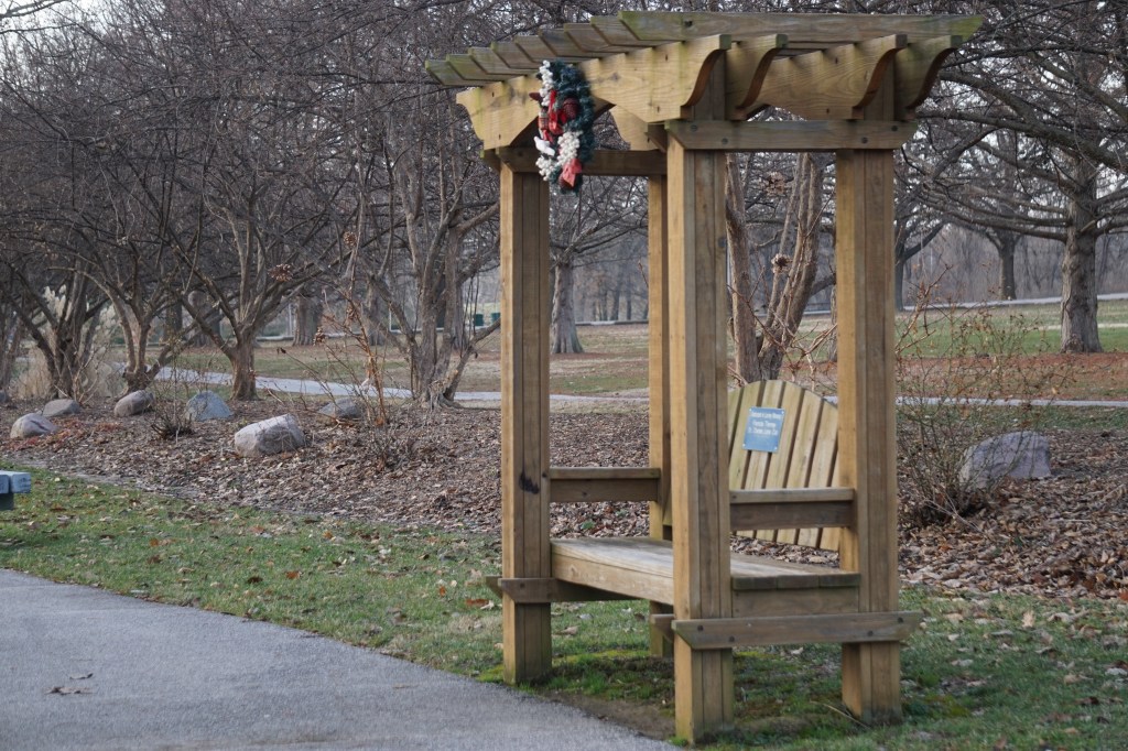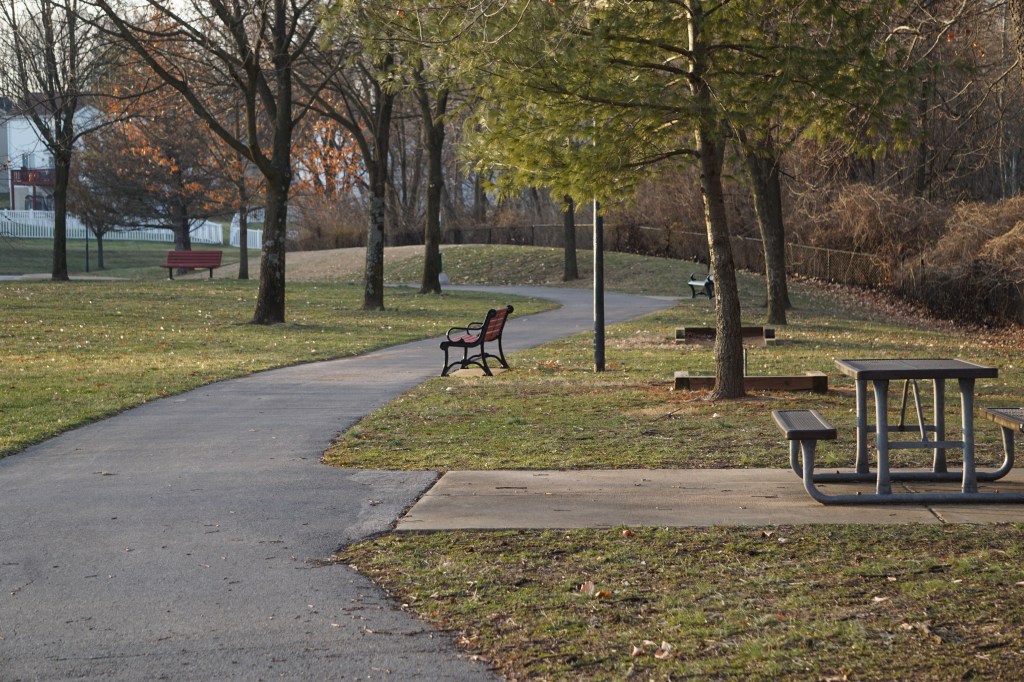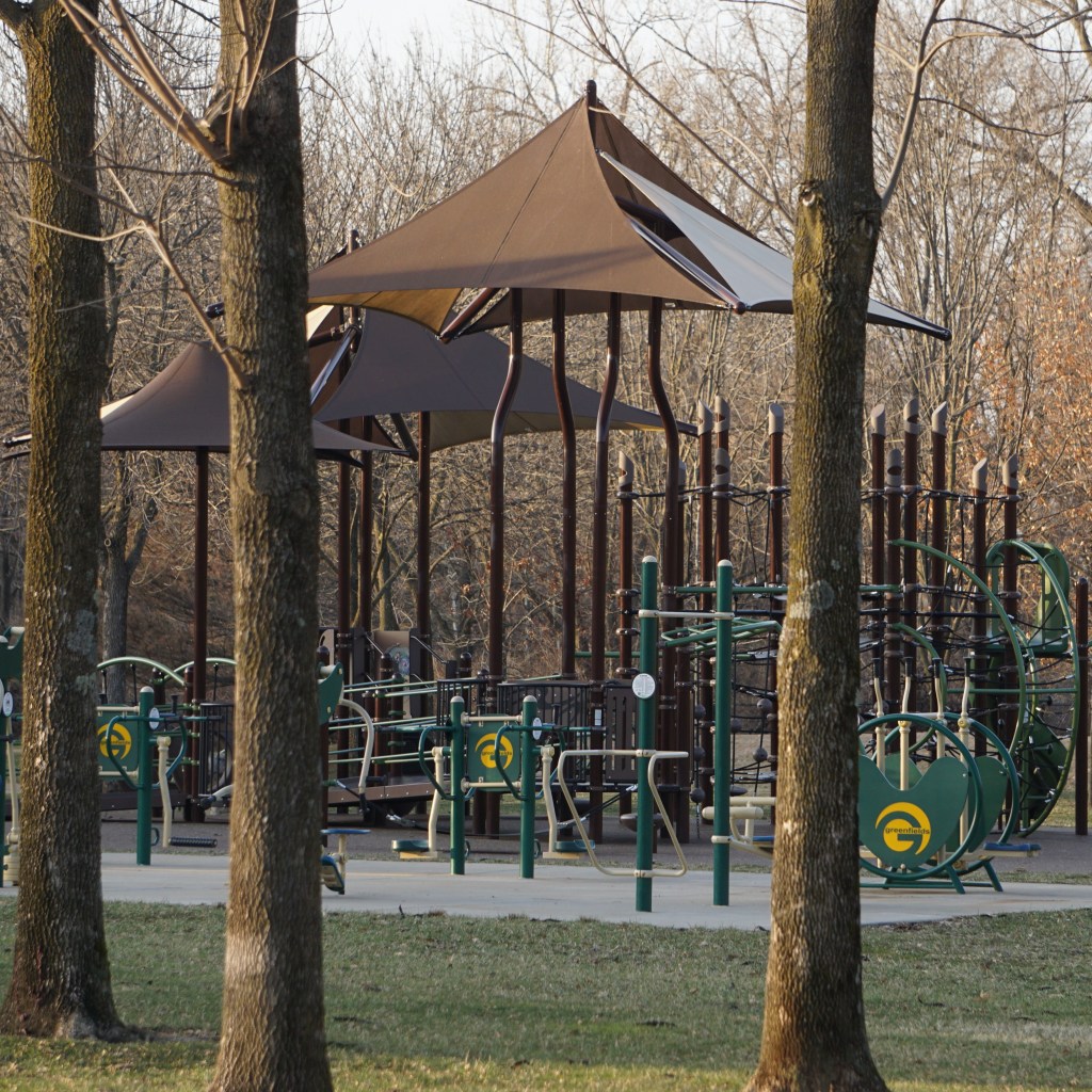 Benches and tiny picnic gazebos line the path, nearly all facing the playground. Wide fields, BBQ grills and horseshoe pits add to the family fun.