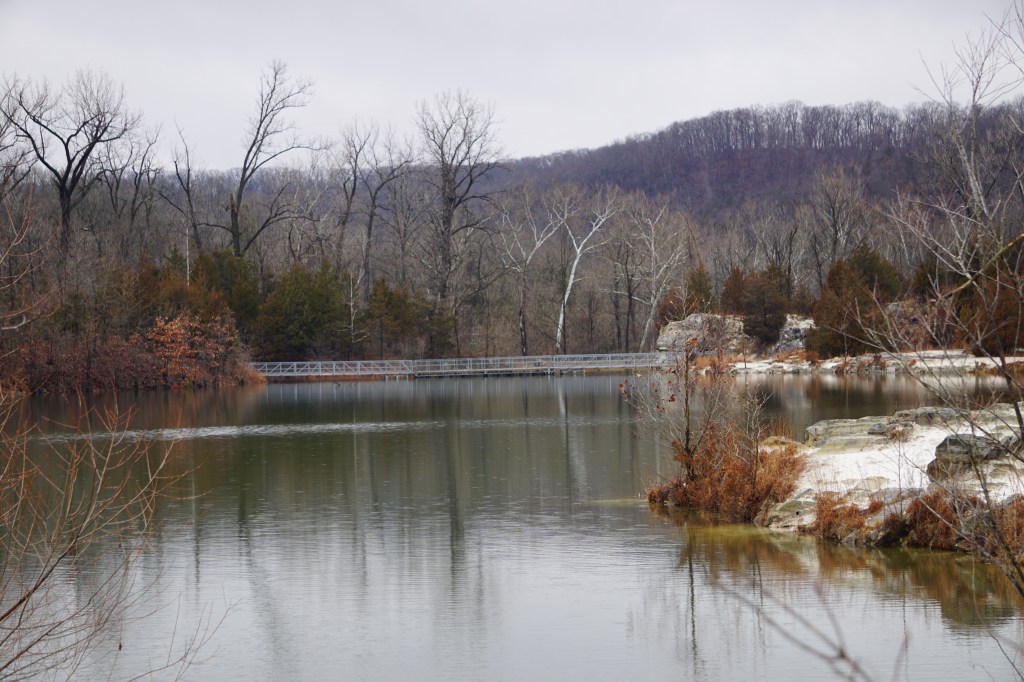 Even in August, the white sands of the quarry look like snow. Today, it feels so natural, it’s easy to forget that it’s not. Floods, not snow, are the problem today, though a little is predicted for tonight. I drove through water on highway 94 to get here and Katy trail detour signs line the park.