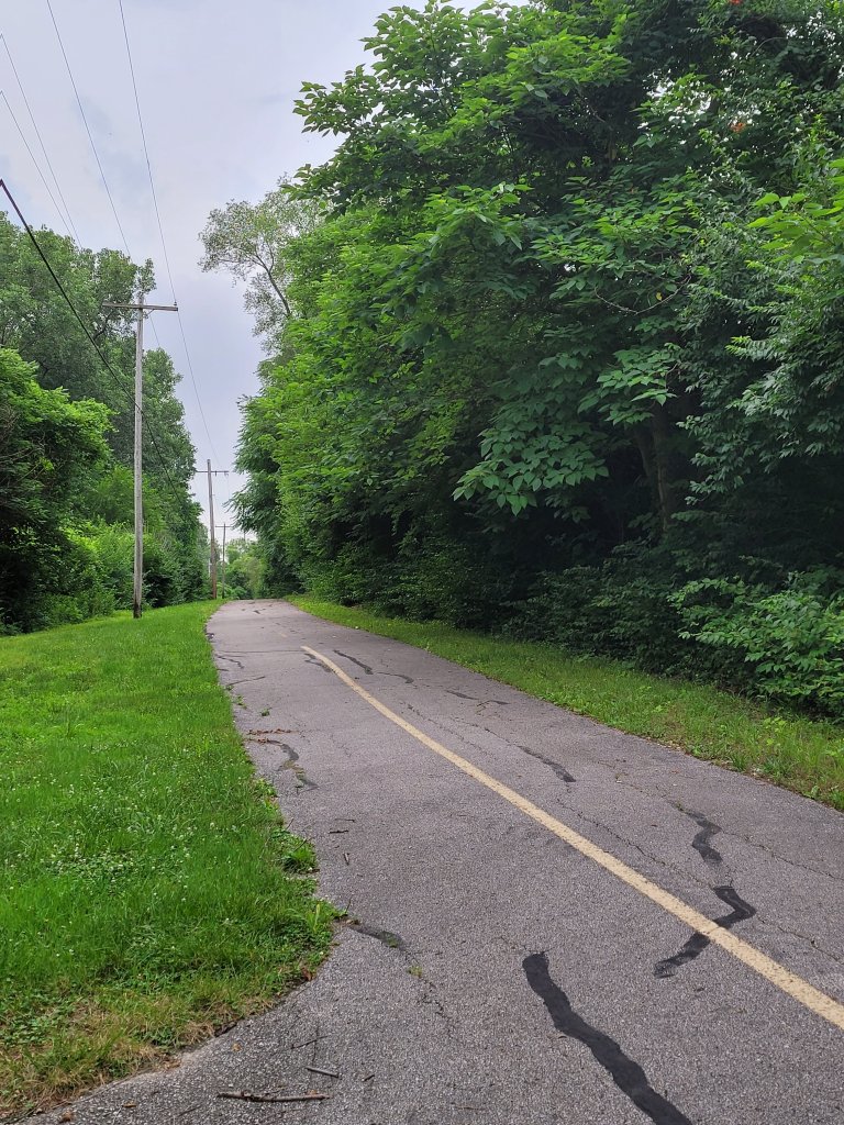 It drops past town, into a thickly wooded neighborhood trail, that seems to be more heavily used than the earlier section. Translation: I meet probably 8 -10 people versus 3 -4.