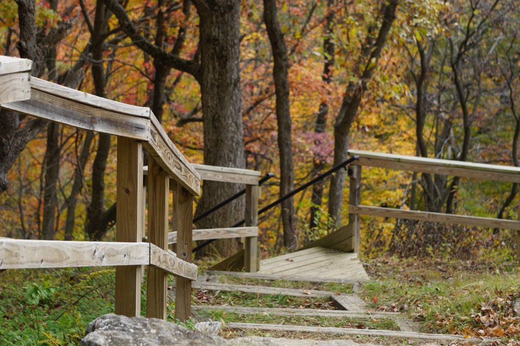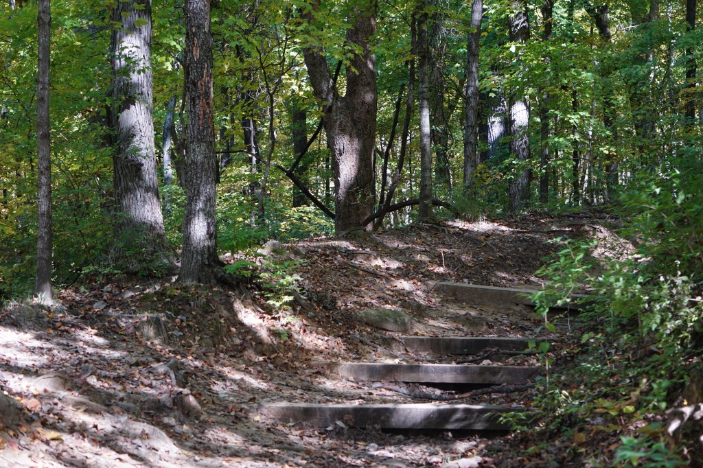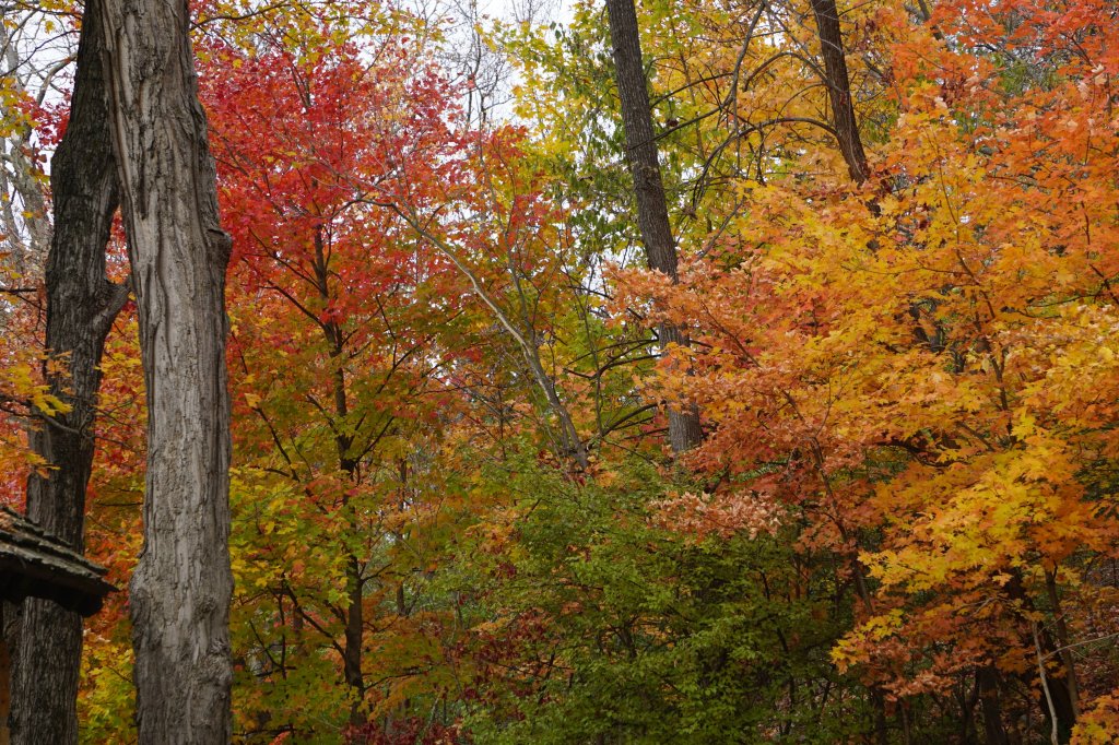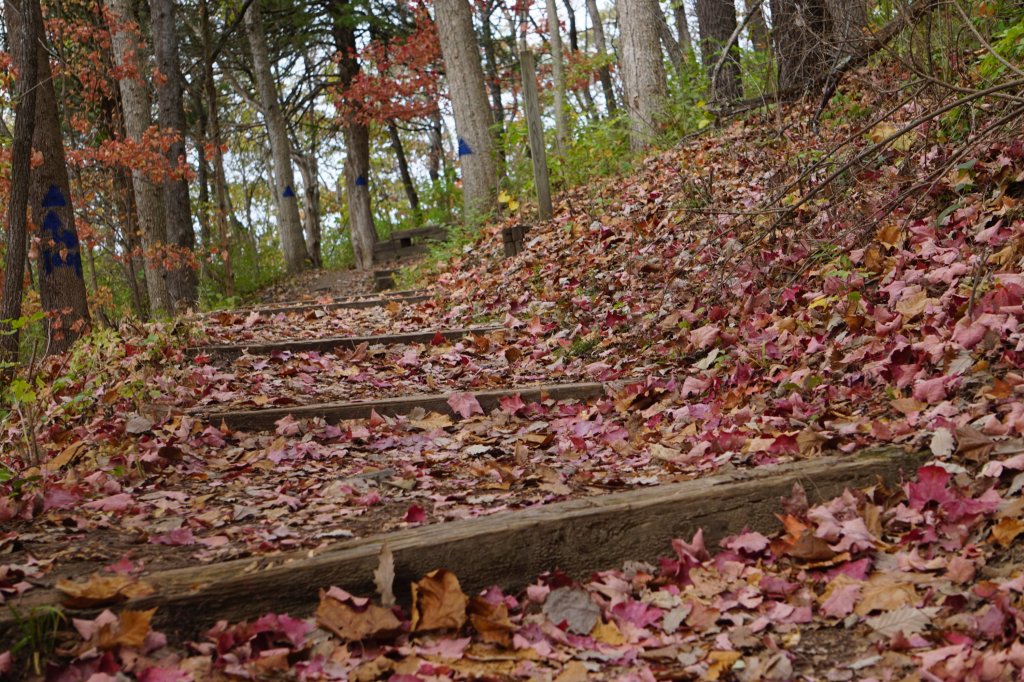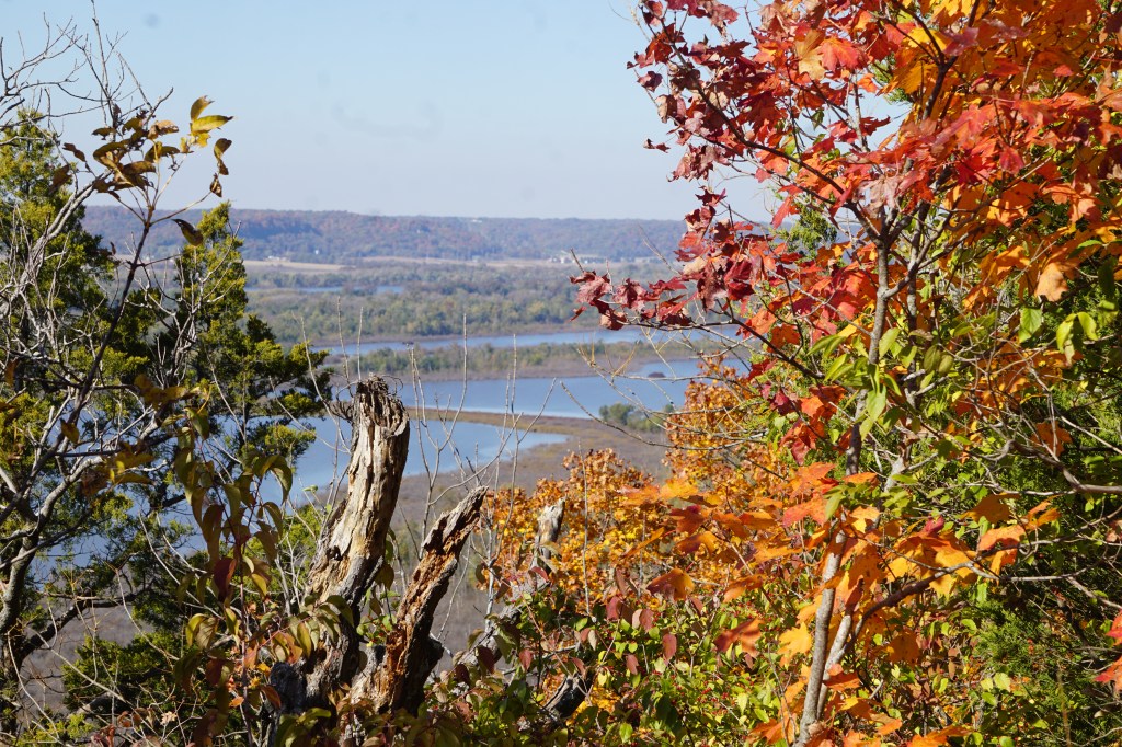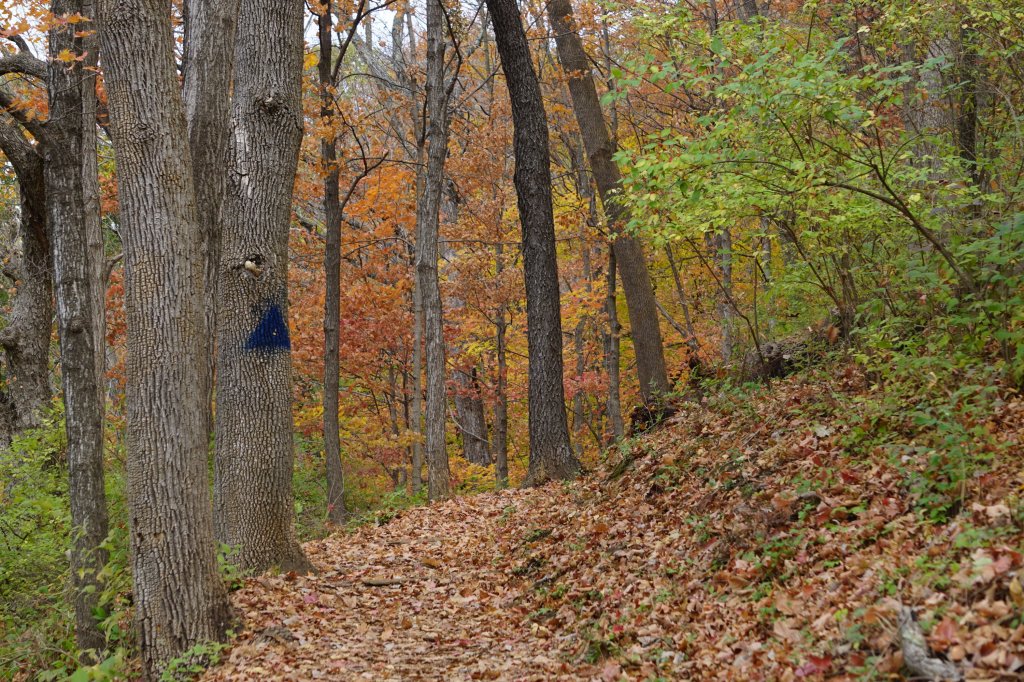 The trail emerges at the top of the bluff, joining the other trails at the overlook shelter, the final glows of summer mingling with the brilliance of fall.