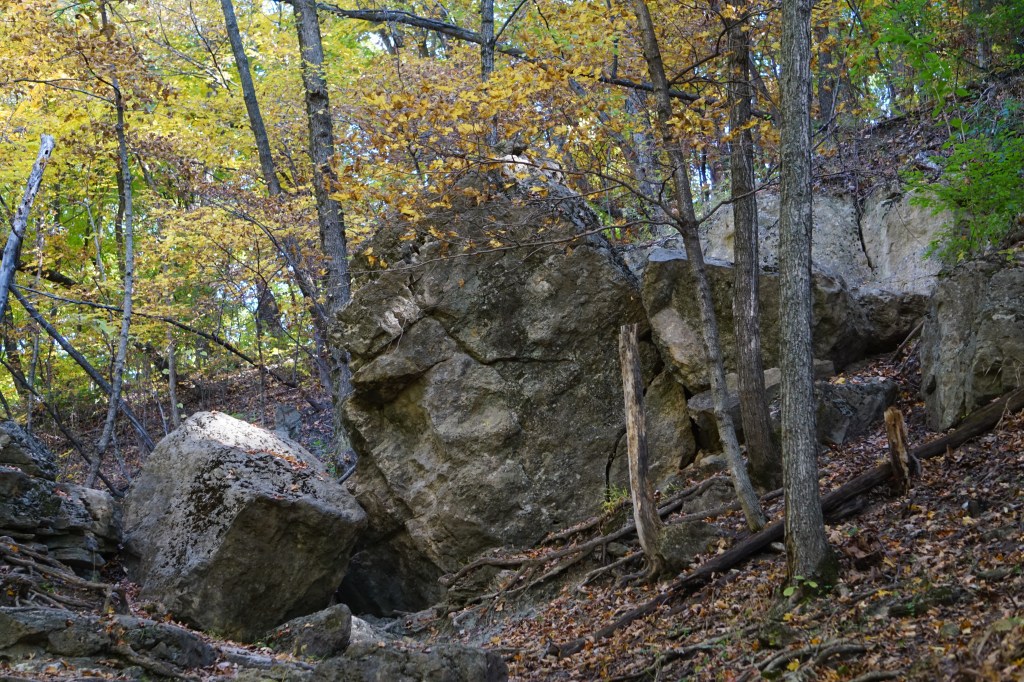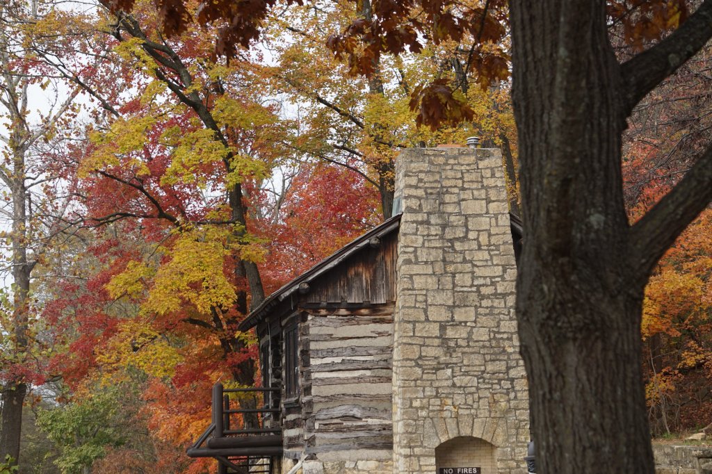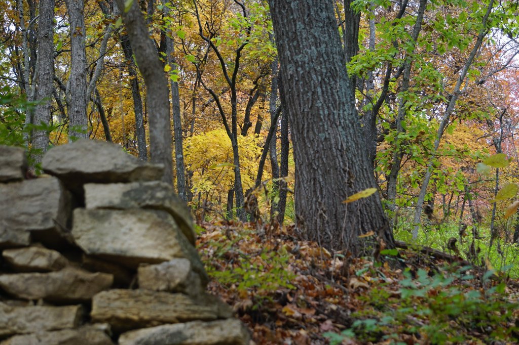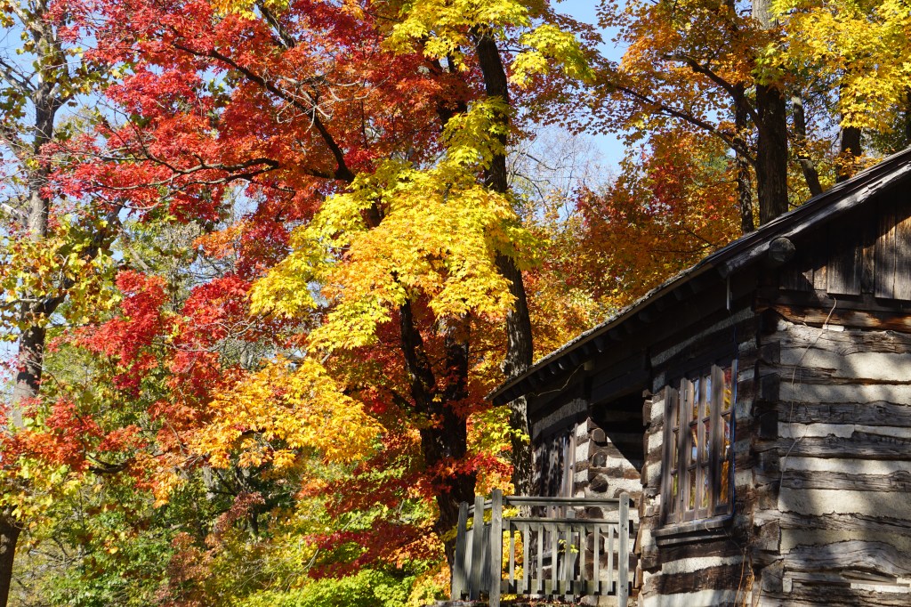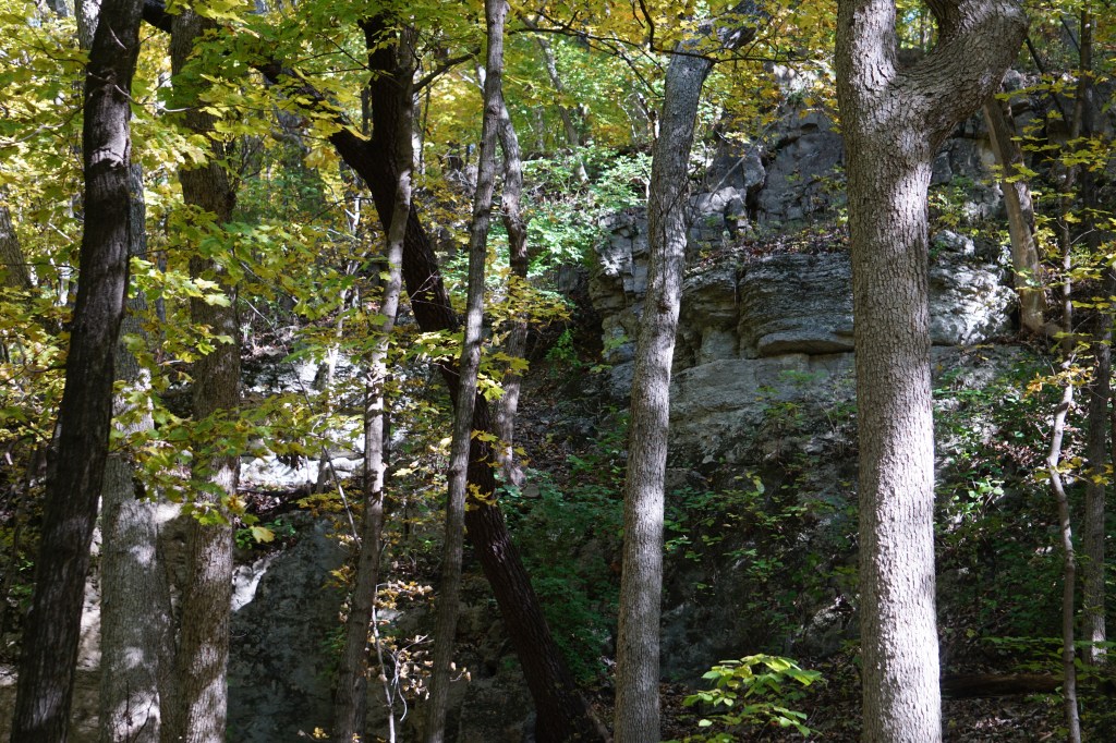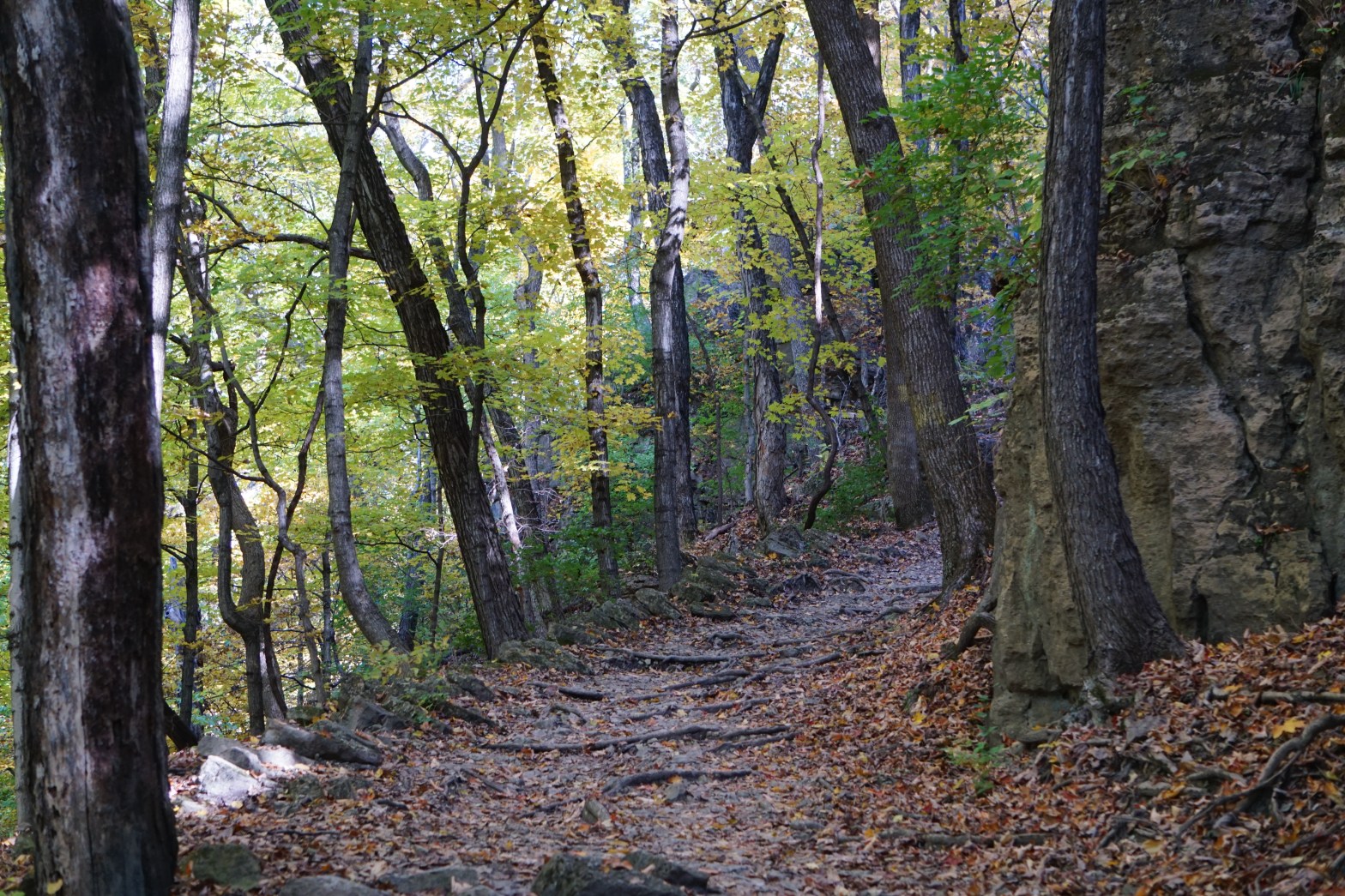 The trail emerges at the top of the bluff, joining the other trails at the overlook shelter, the final glows of summer mingling with the brilliance of fall.