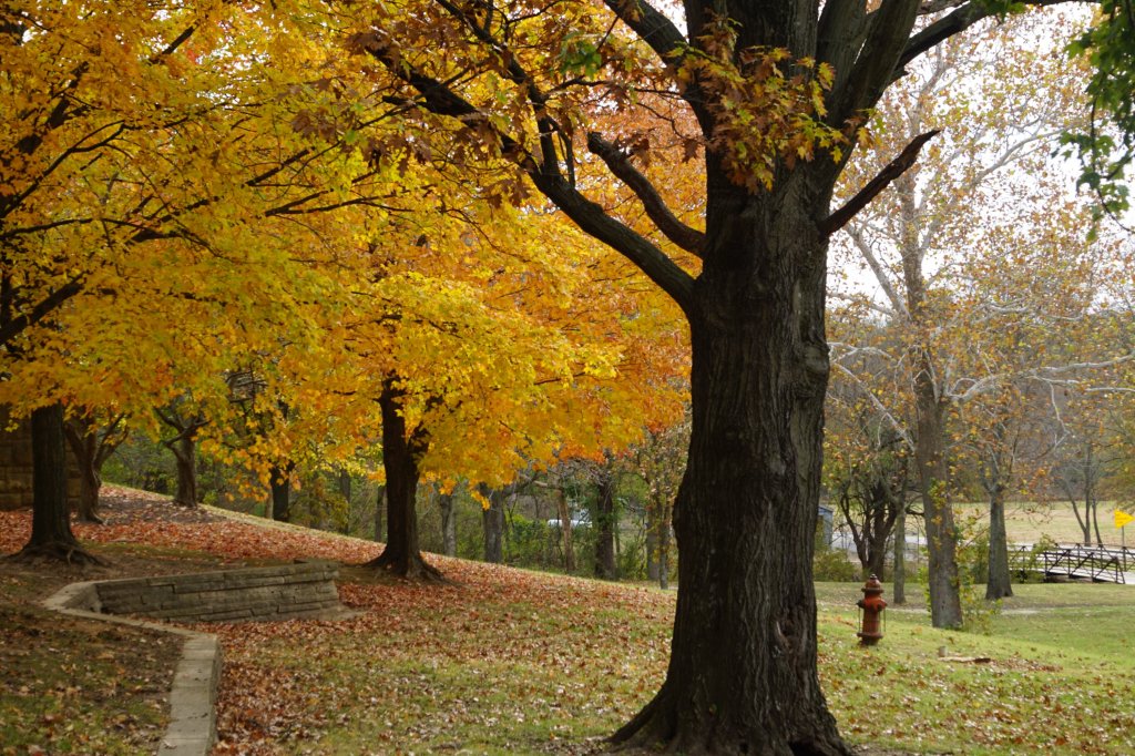 The trees in the park were still thick with leaves, though, and the brilliant sunshine set them aglow like Christmas lights.
