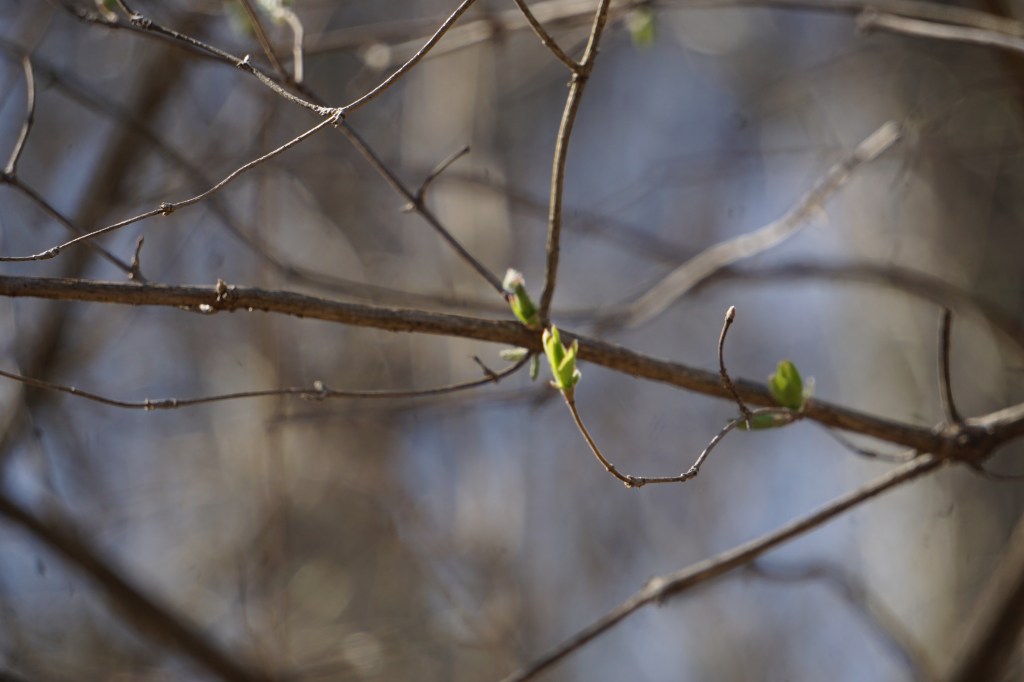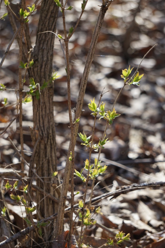 Knee high, half -hidden spring is slipping through the brush, ready to burst into bloom.