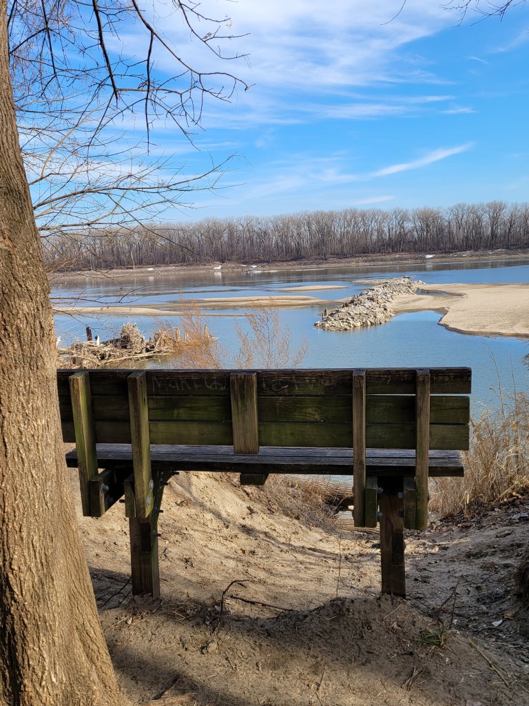 A quiet bench overlooks the cold and sluggish river hopefully resting deeper in the eroded bank than it appears from above.