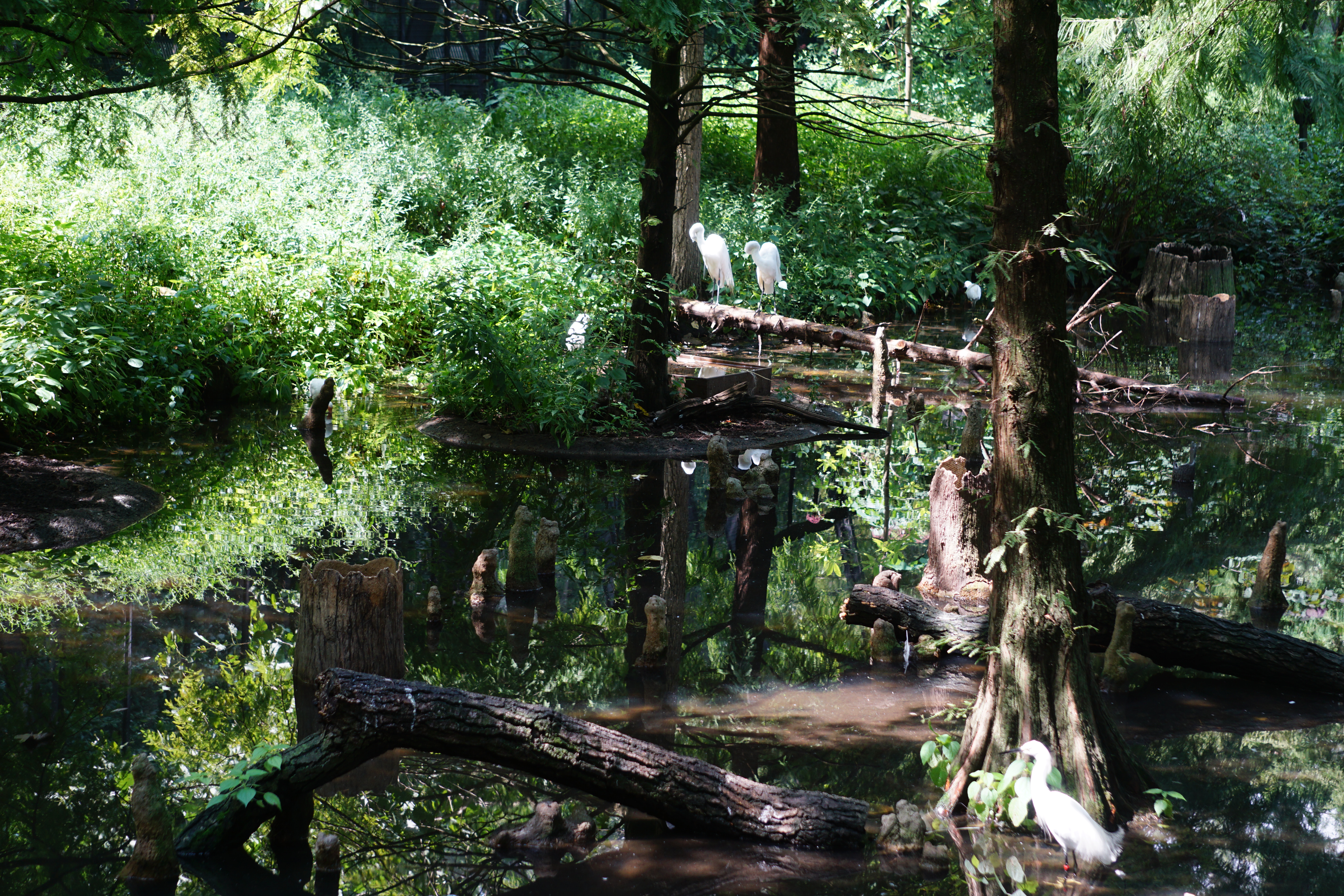 Cypress swamp, the old 1904 World’s Fair flight cage, is as hushed as a natural swamp. The soft splash and rustle of the birds themselves, seemed muffled against the thick trees. Only the little duck seems to make much noise, insulted by the attention paid to the showier birds.