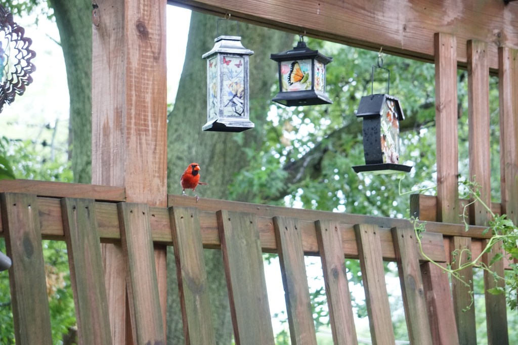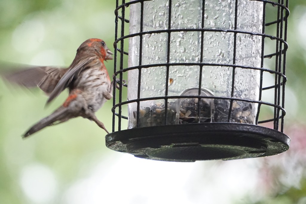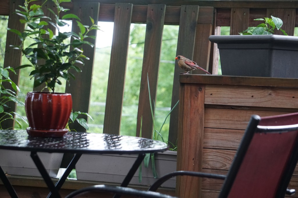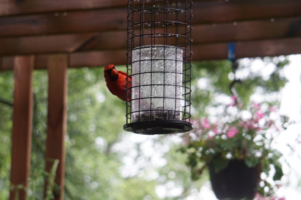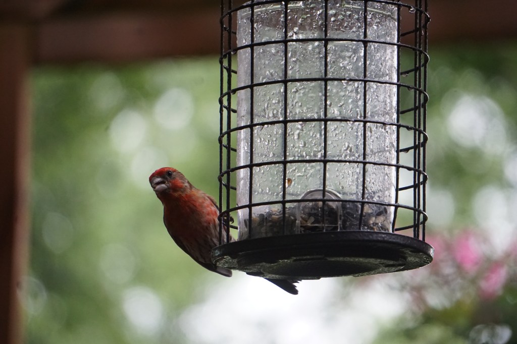 They finally gave up. The birds have spent their days this spring and early summer darting in to snatch a mouthful of seed, angrily scolding the squirrels who hang from their feeder, and dodging my every attempt to capture them with my camera.