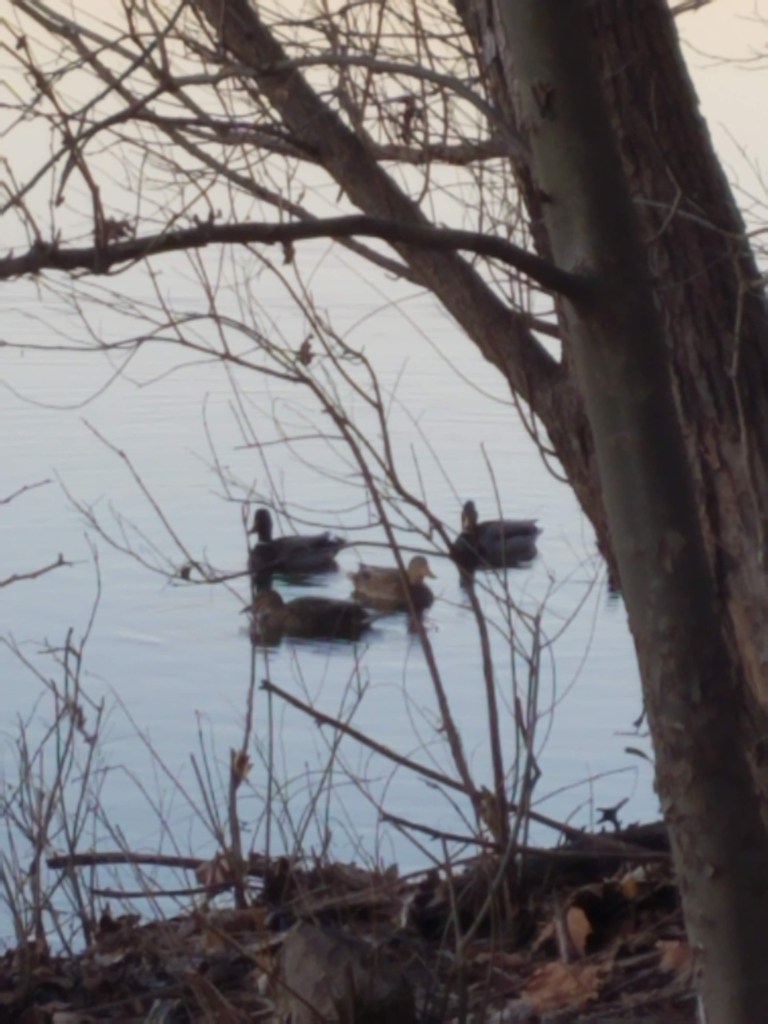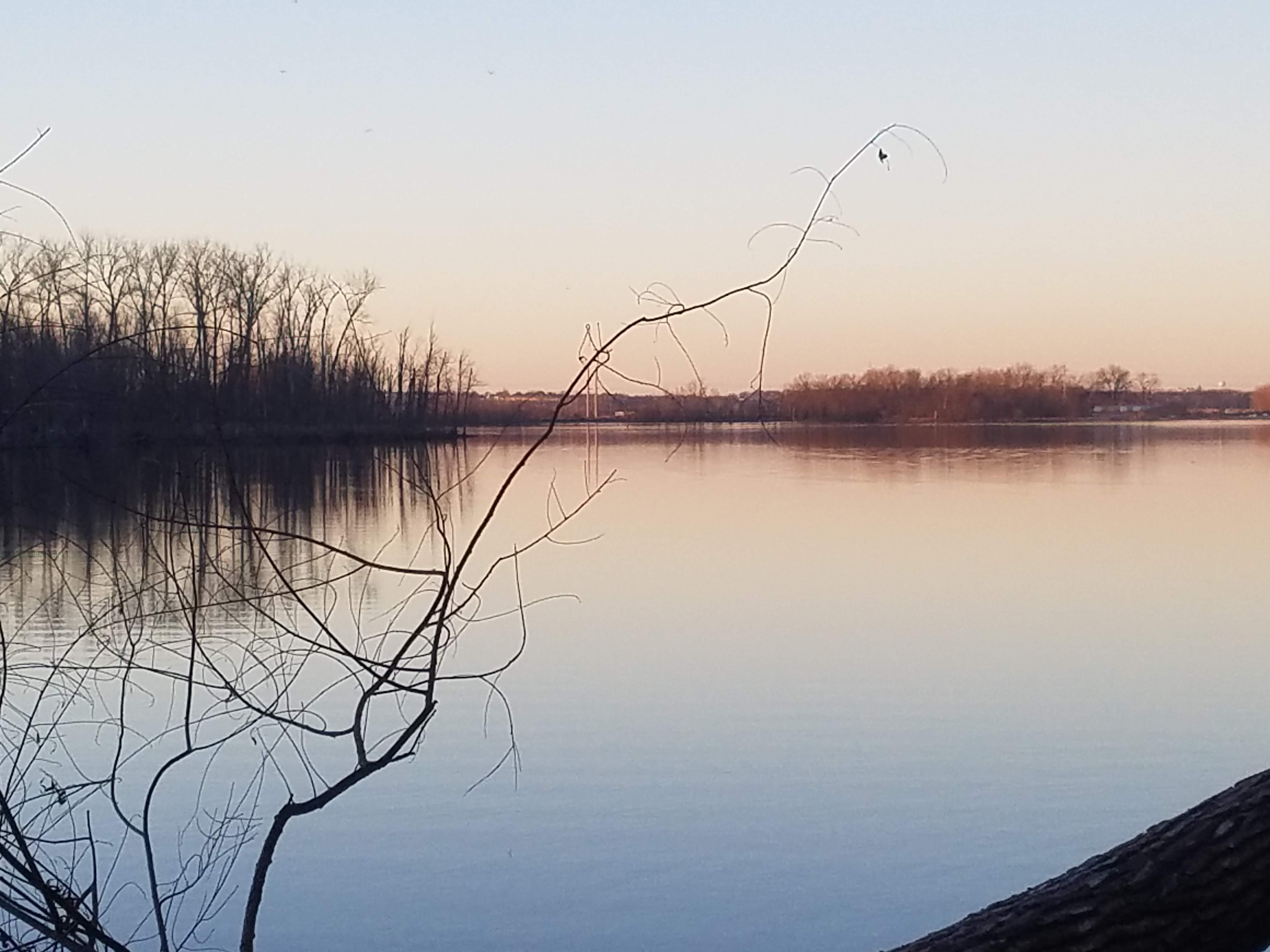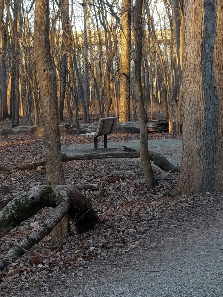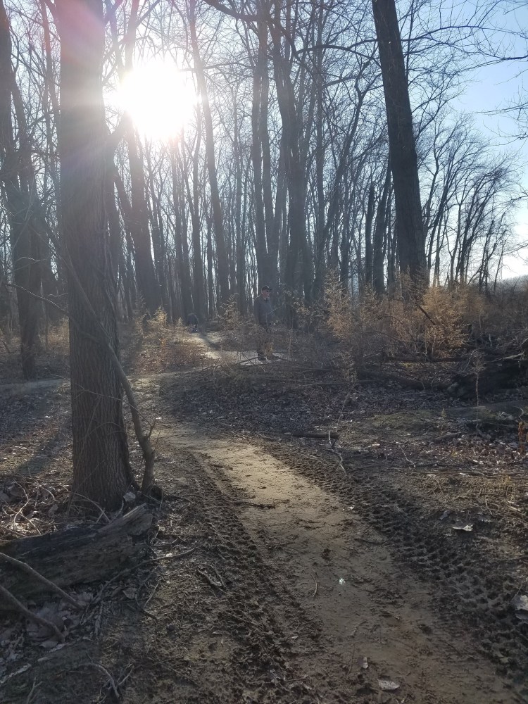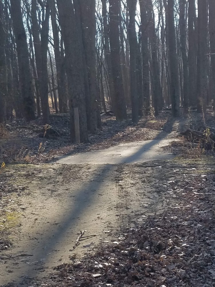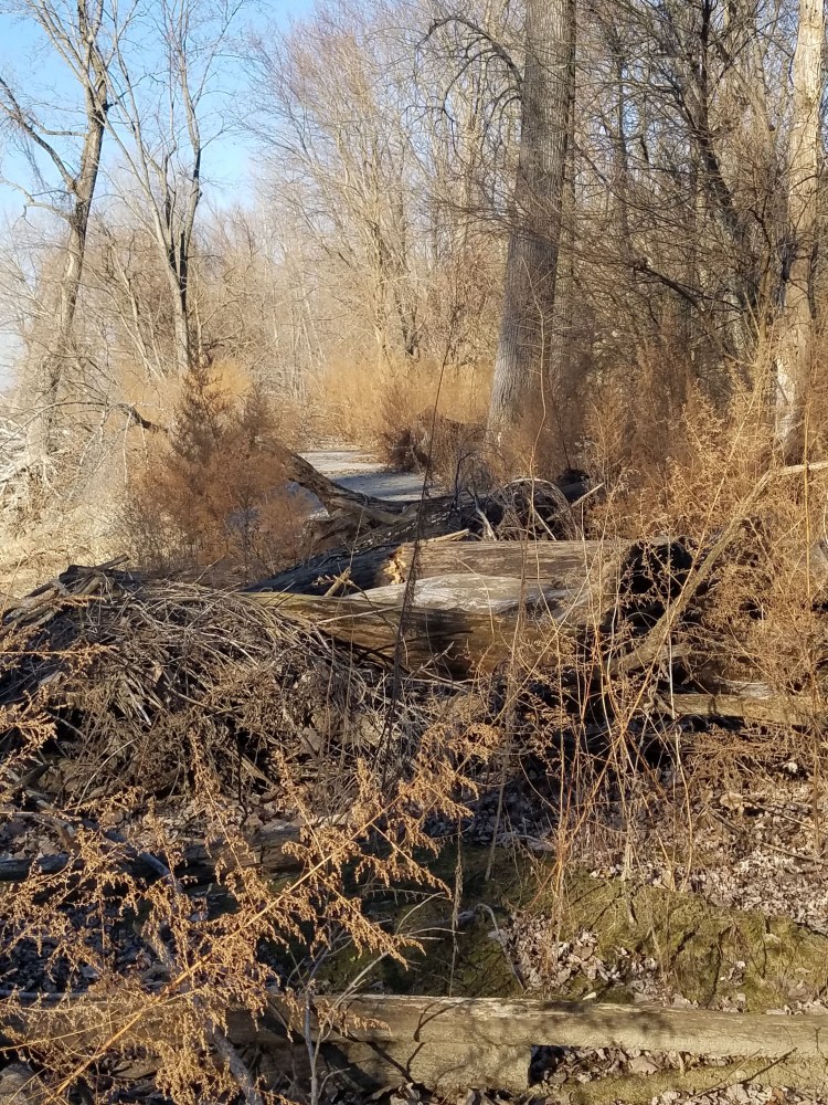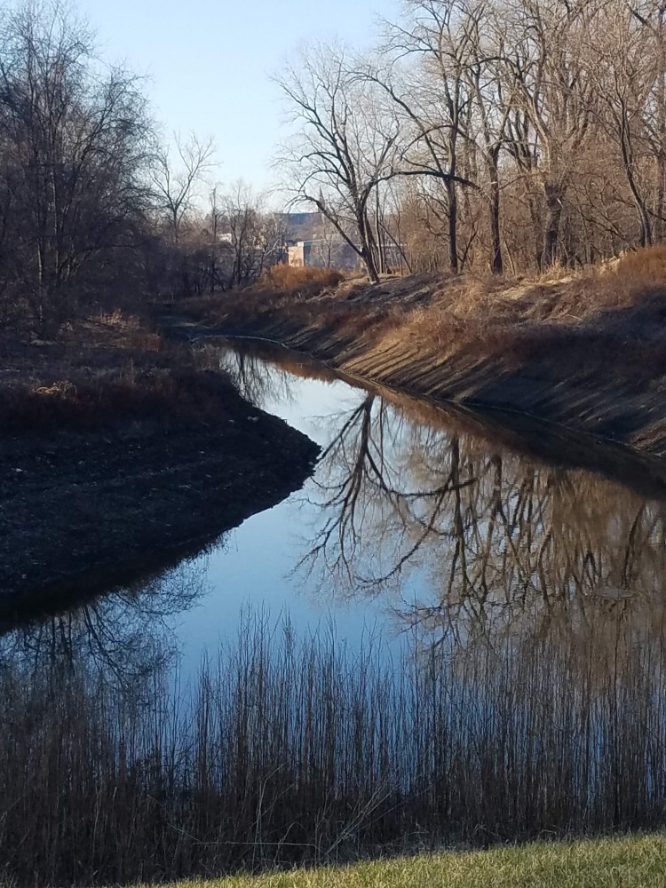 It’s wintery quiet with pale slanting sunshine and trees huddled bare against the cold. The broken pavement trail drops into the river half way around the loop. The river swirls in, asserting its strength, while enterprising trail users have cut their own new path through the woods.