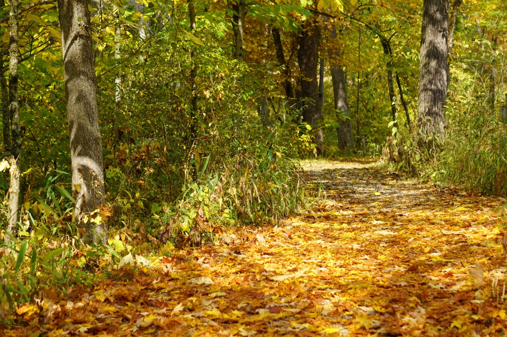 From there, the it winds down the hill and onto Pine Amphitheater trail, the towering evergreens edged by golden piping of fall.