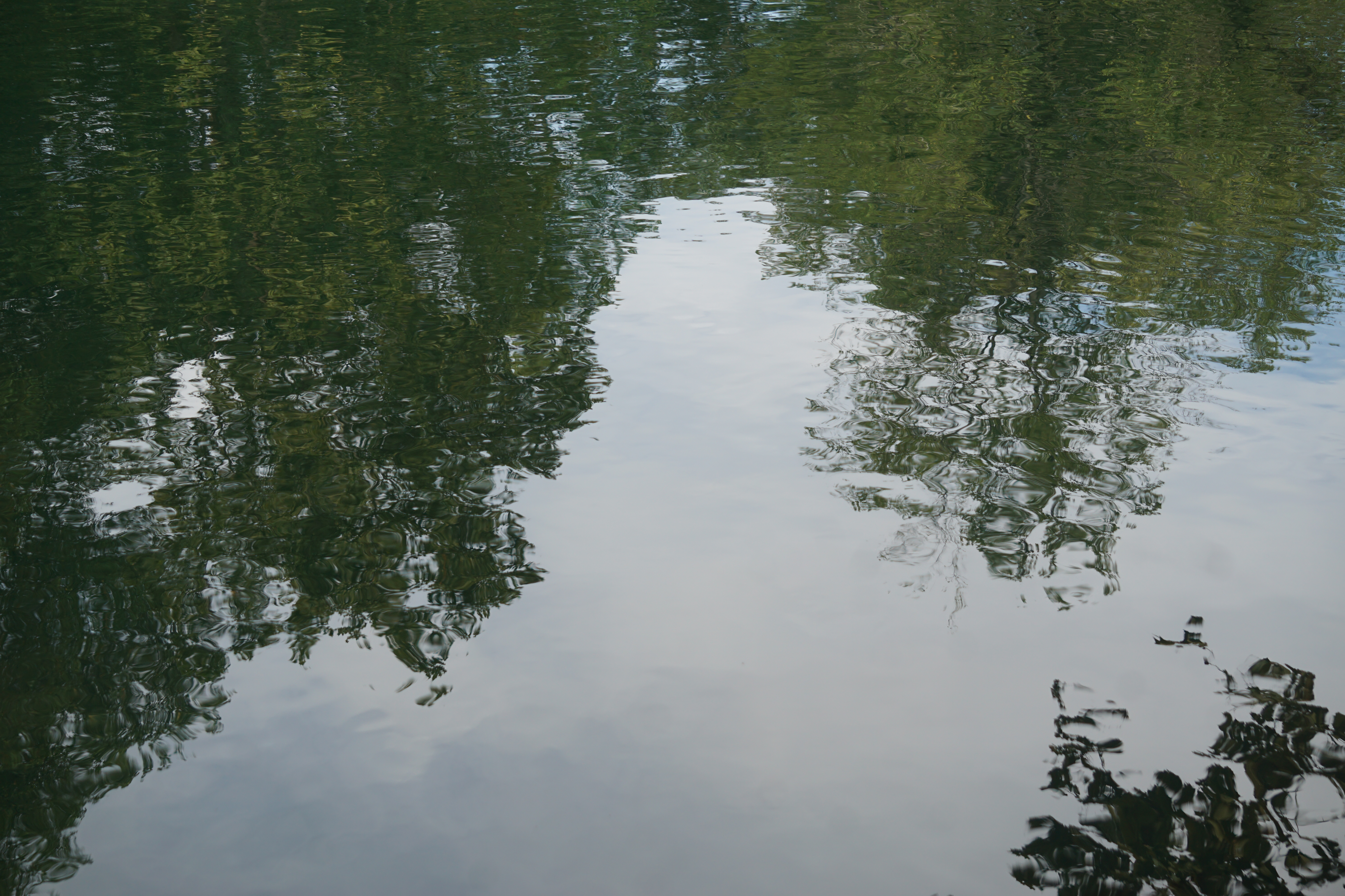 The short paved trail curves up from the edge of the pond, thick with the falling leaves.